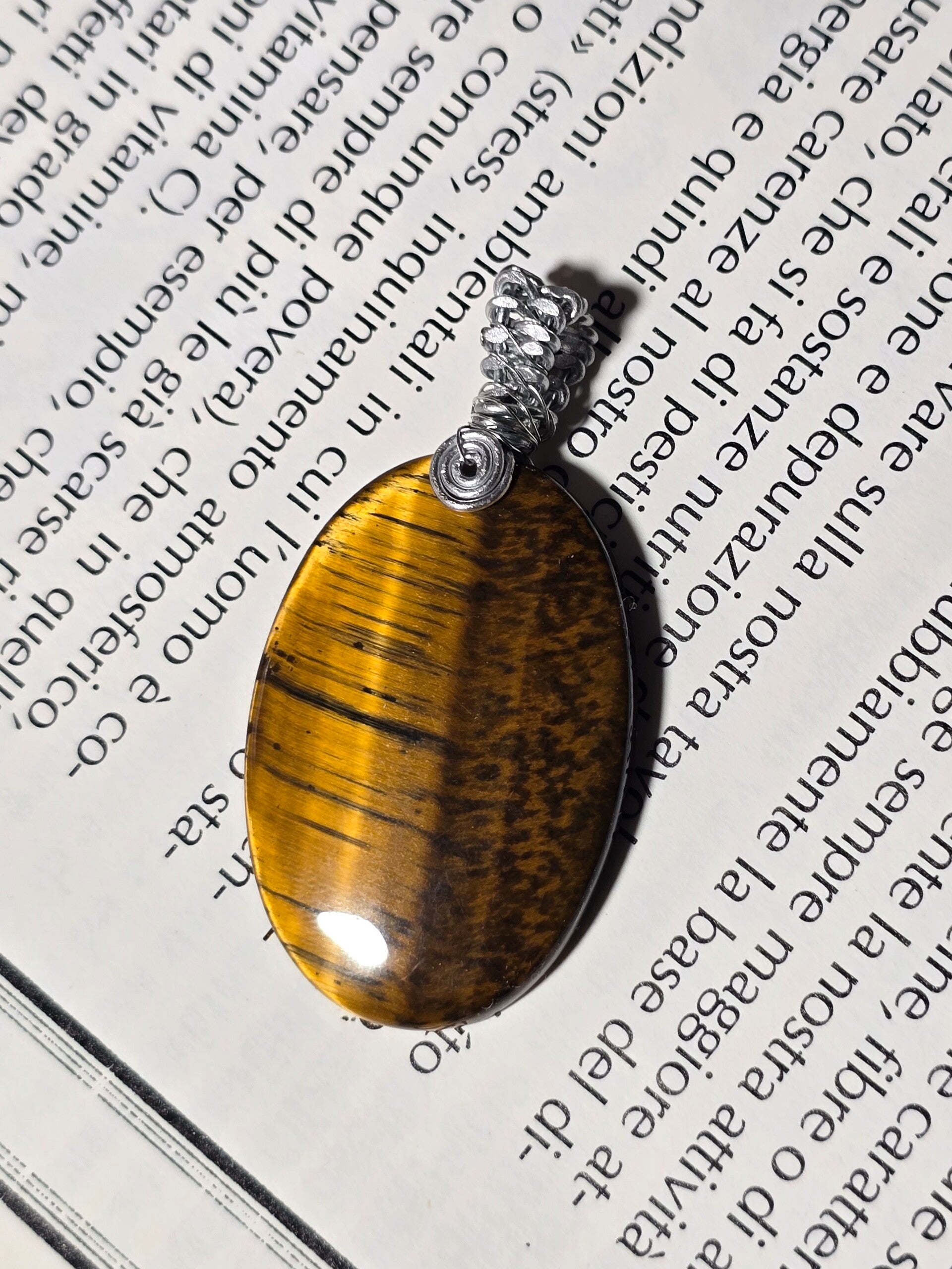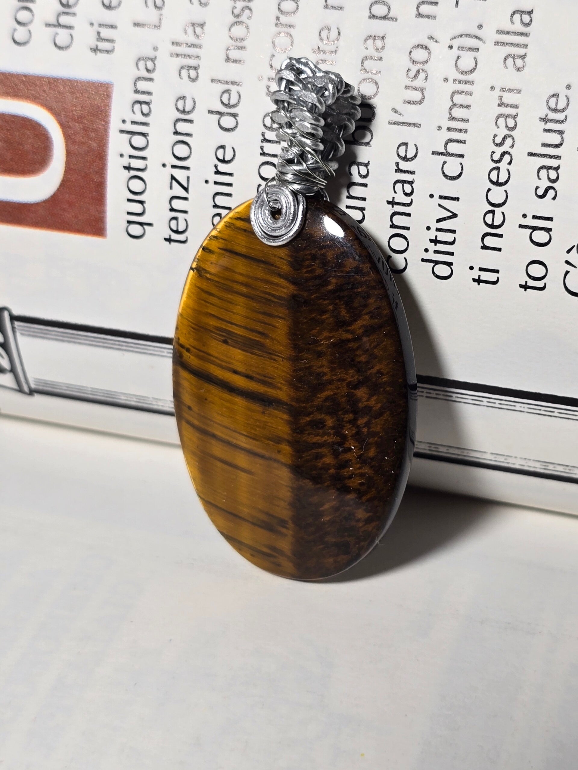 Elegante ciondolo in Occhio di Tigre naturale, dalla forma ovale e dalle intense tonalità dorate e brune che riflettono la luce con splendidi giochi naturali. La pietra, accuratamente levigata, è impreziosita da una lavorazione artigianale in filo metallico, che rende ogni pezzo unico e irripetibile.