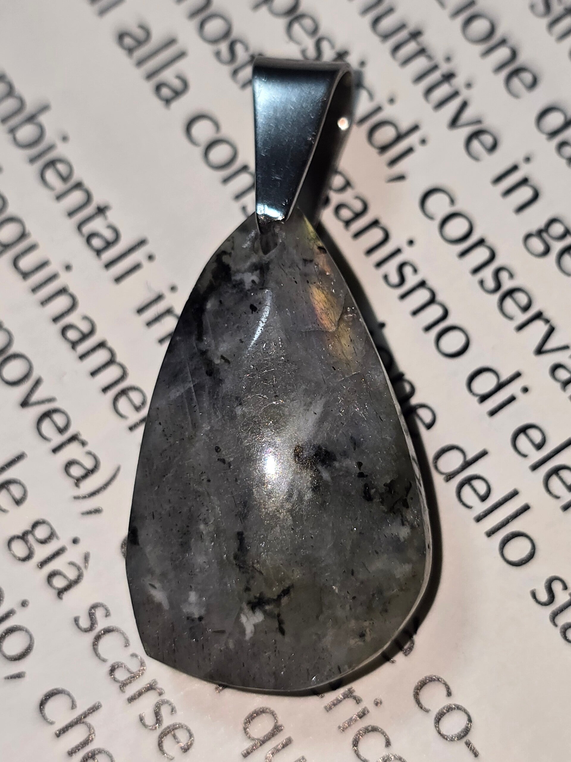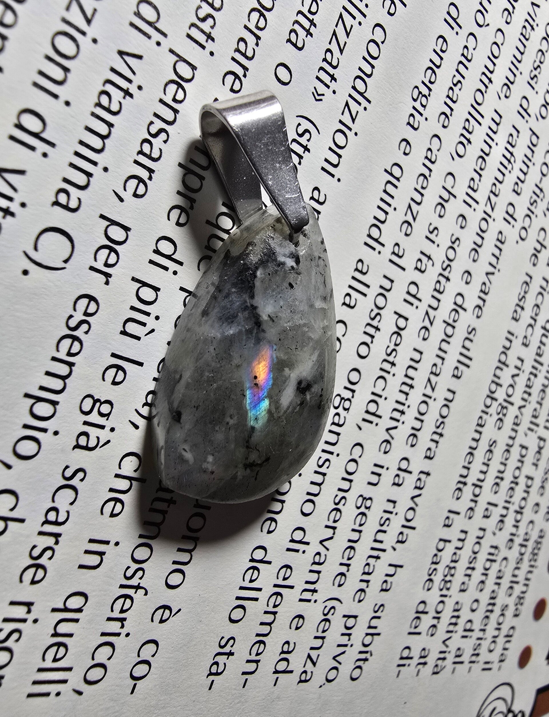 Delicato mini ciondolo realizzato in Labradorite Bianca naturale, impreziosita da raffinati riflessi arancio dorato, viola e blu che emergono alla luce creando un effetto luminoso e cangiante. Ogni pietra è unica e presenta giochi di colore sempre diversi.