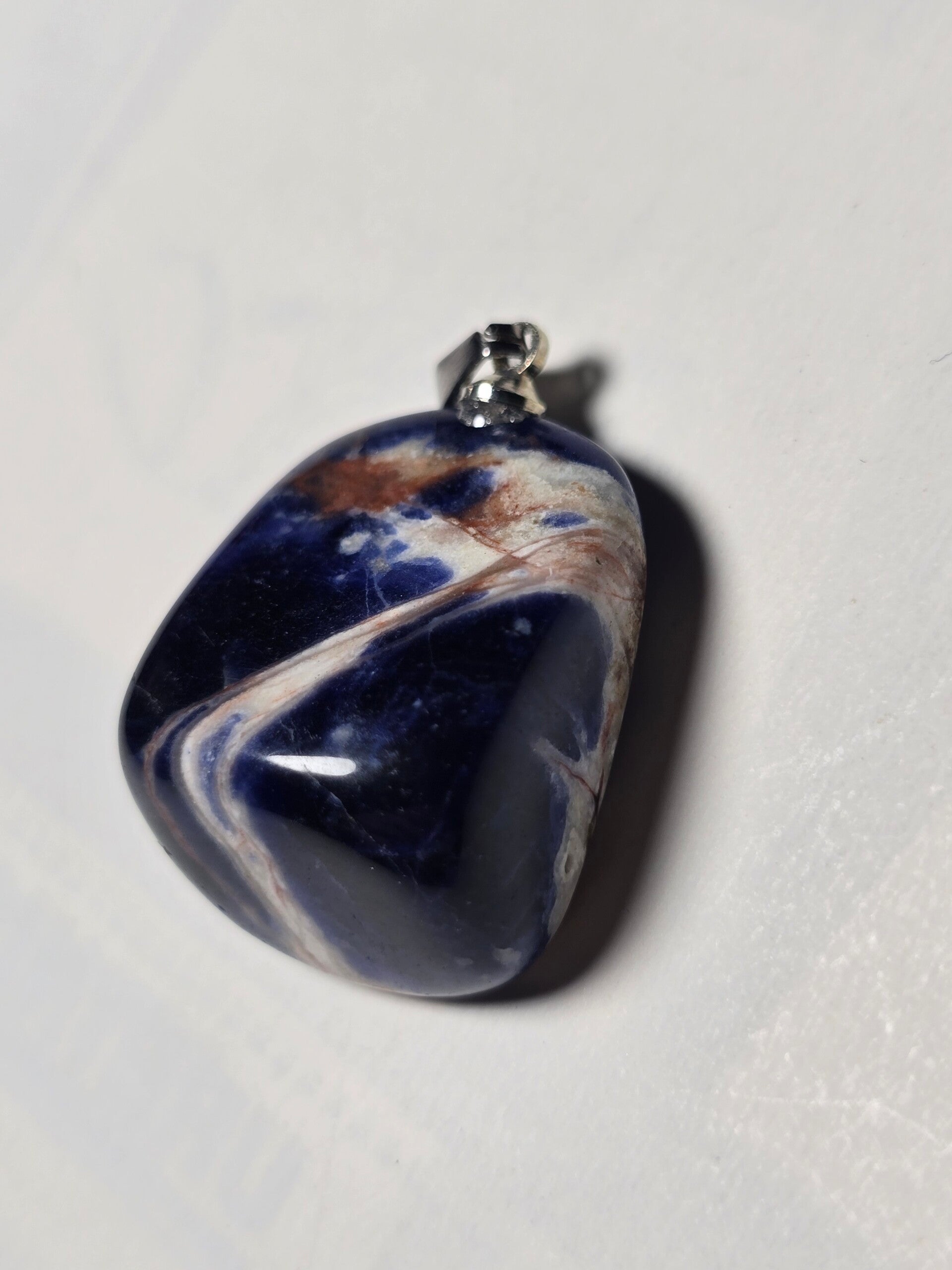 Ciondolo realizzato in sodalite naturale, una pietra dal profondo blu intenso attraversato da delicate venature bianche. Elegante e magnetica, la sodalite è associata alla chiarezza mentale, all’intuizione e alla comunicazione autentica.