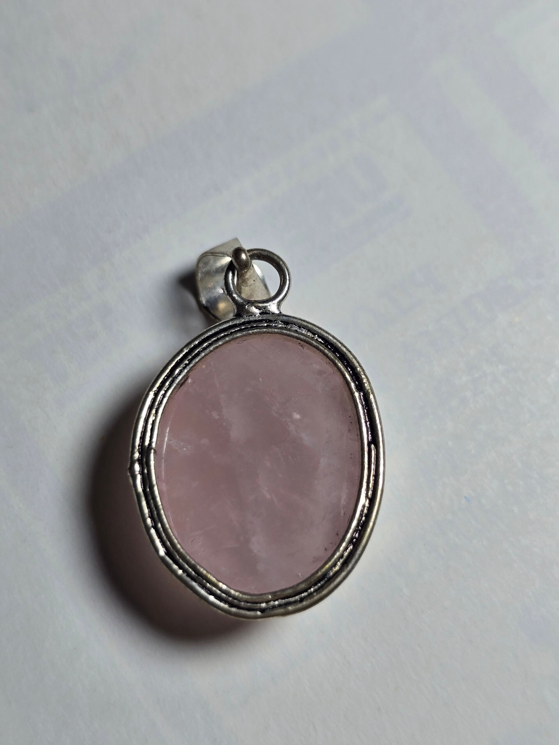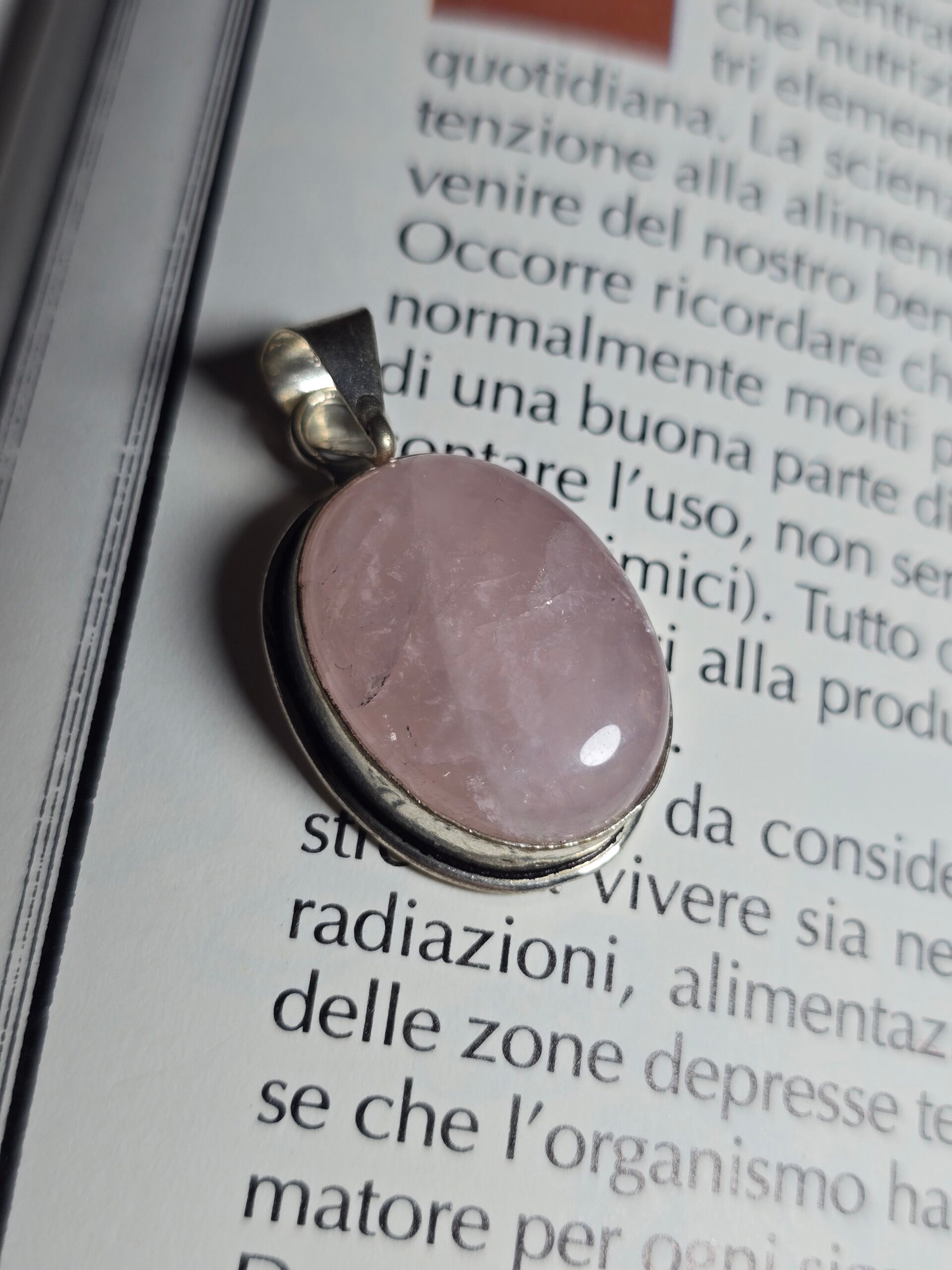 Elegante ciondolo ovale in quarzo rosa, simbolo di amore, armonia e dolcezza. Favorisce apertura del cuore, calma e relazioni positive, unendo bellezza naturale e significato emozionale.