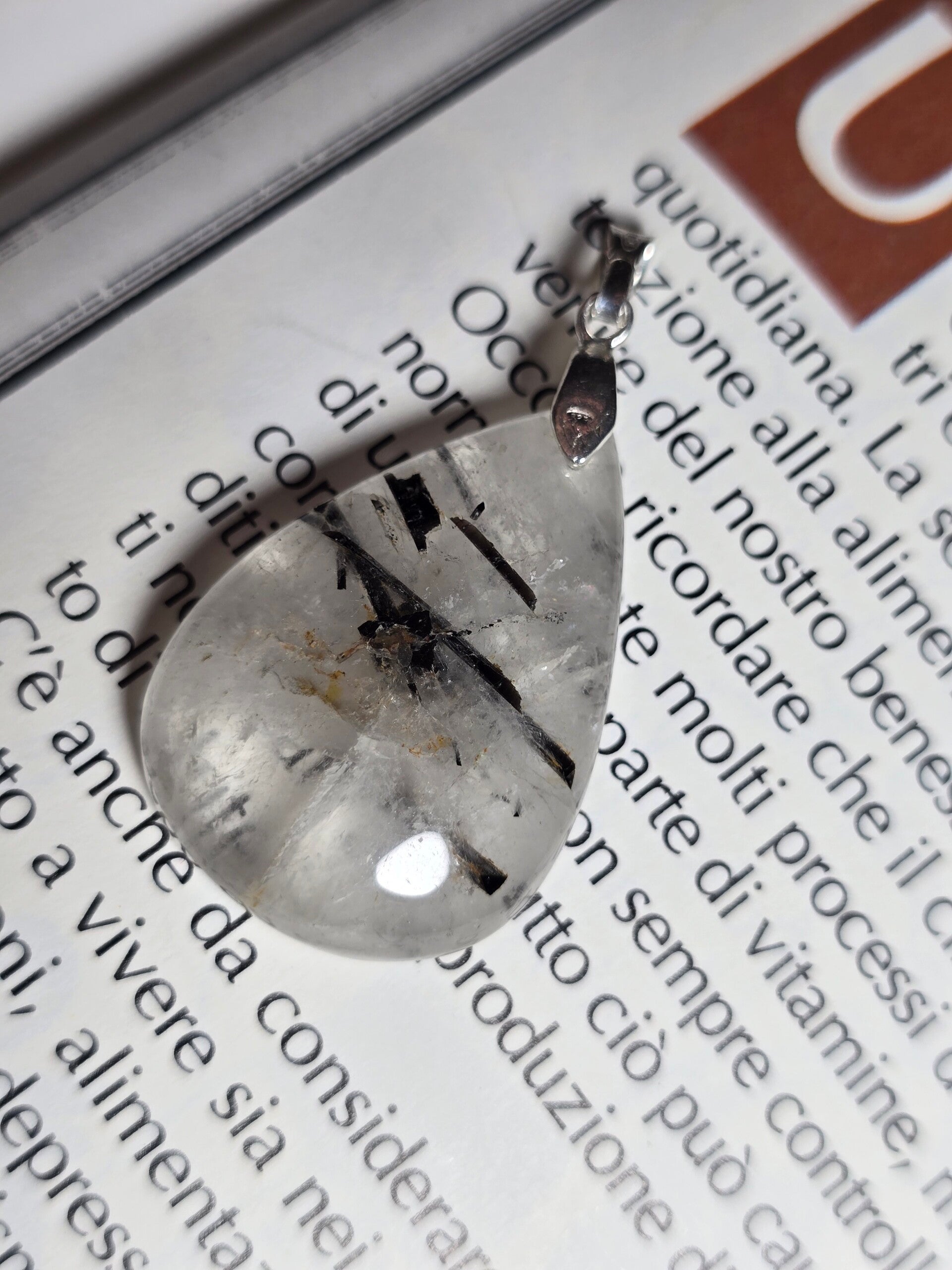 Raffinato ciondolo a forma di goccia in Quarzo Tormalinato naturale, caratterizzato da eleganti inclusioni nere di tormalina che creano un contrasto unico e affascinante. Ogni pezzo è diverso, con venature naturali che rendono il gioiello irripetibile.