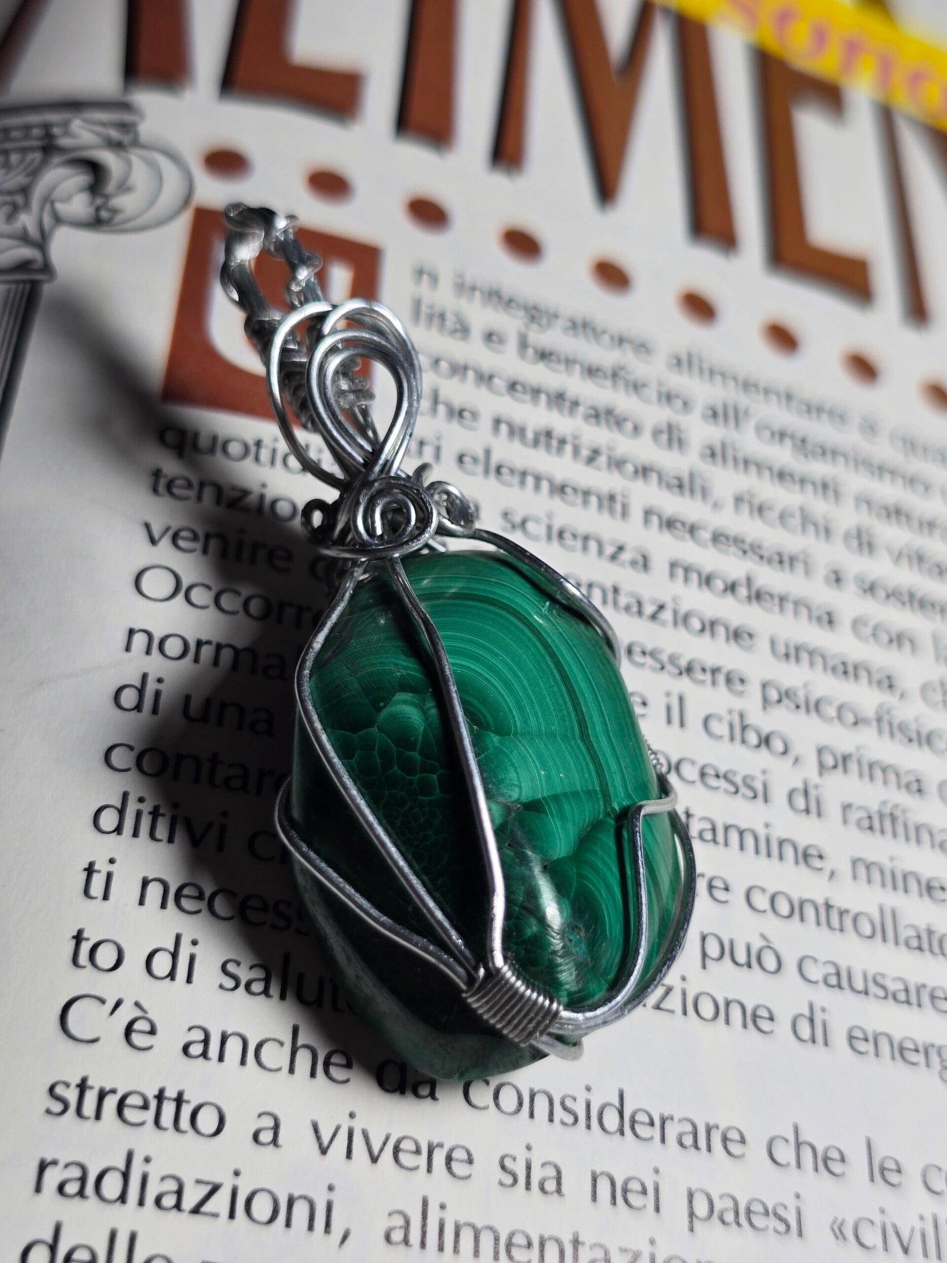 Affascinante ciondolo in Malachite naturale, avvolto a mano con tecnica wire artigianale che ne valorizza le caratteristiche venature concentriche verde intenso. Ogni pietra presenta disegni unici creati dalla natura, rendendo ogni pezzo irripetibile.