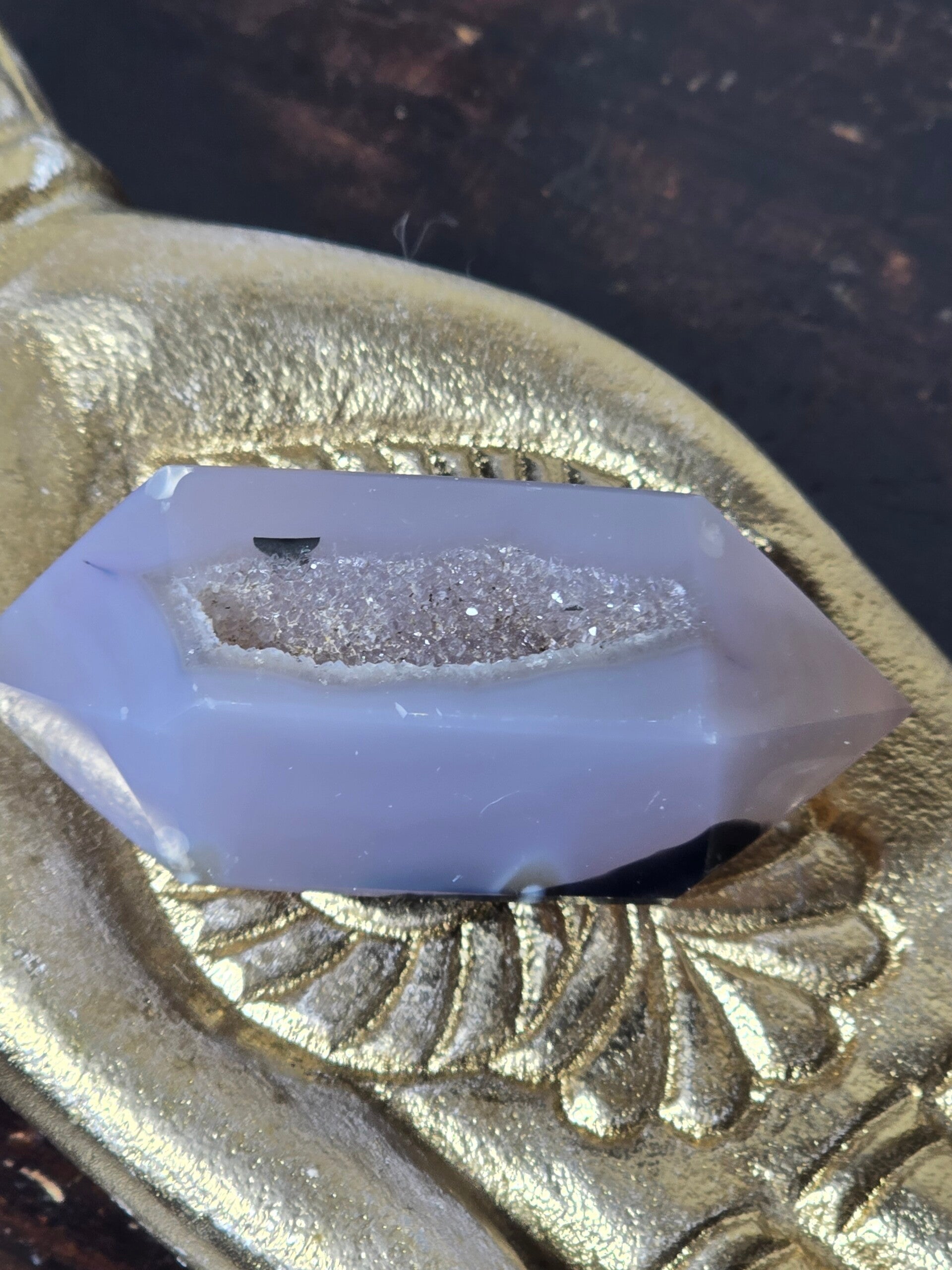 Al centro si apre un piccolo squarcio cristallizzato: una mini cavità che custodisce microcristalli luminosi, capaci di catturare la luce e creare riflessi brillanti e profondi.