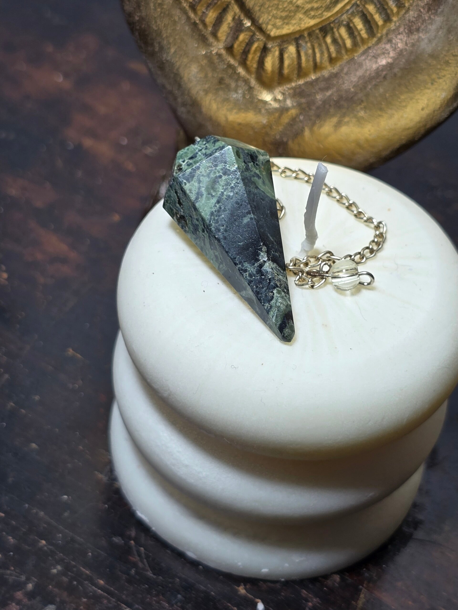 Pendolo realizzato in Kambaba, pietra dalle tonalità profonde di verde scuro con eleganti vortici e macchie nere che creano un effetto naturale quasi ipnotico.