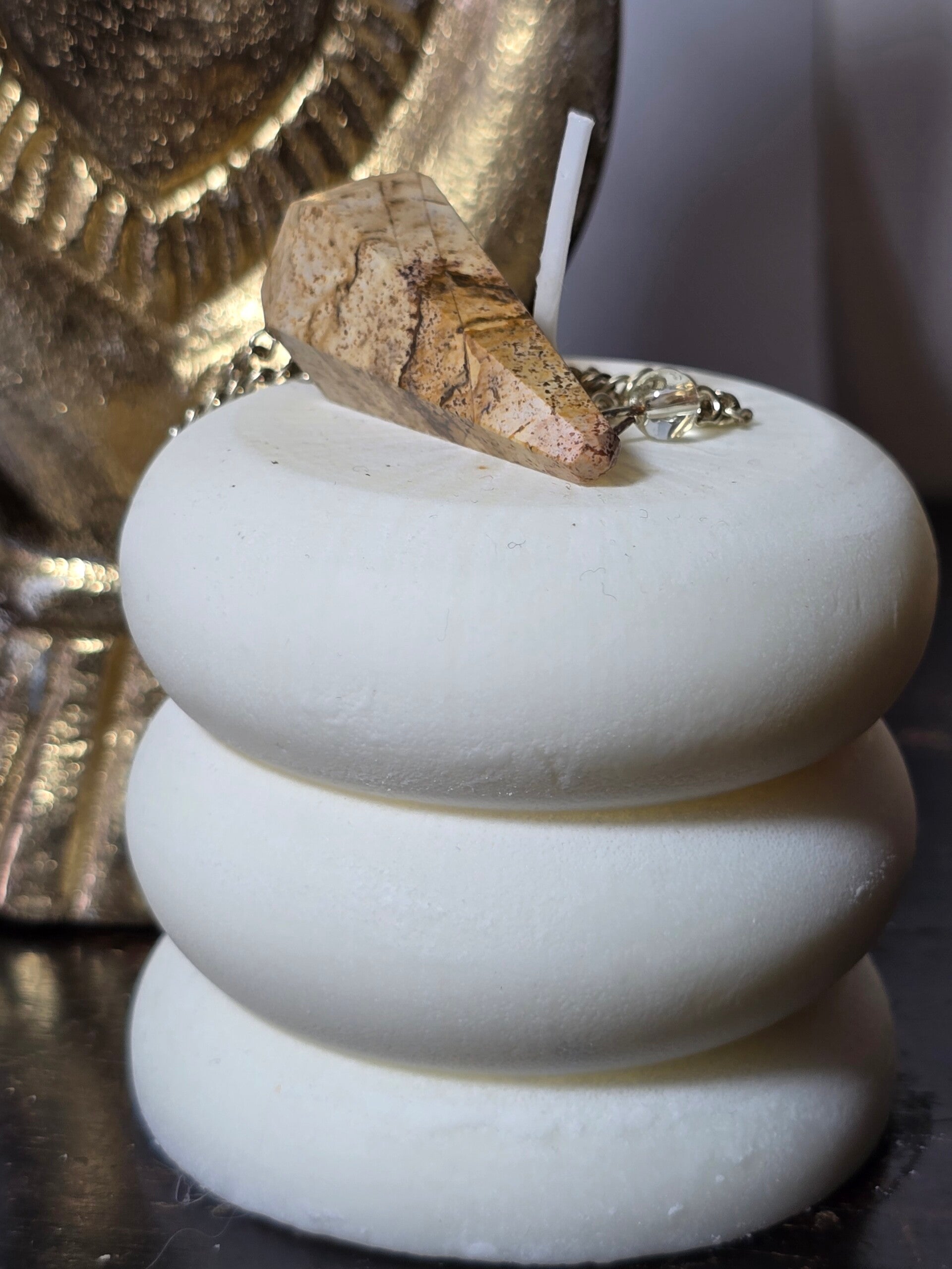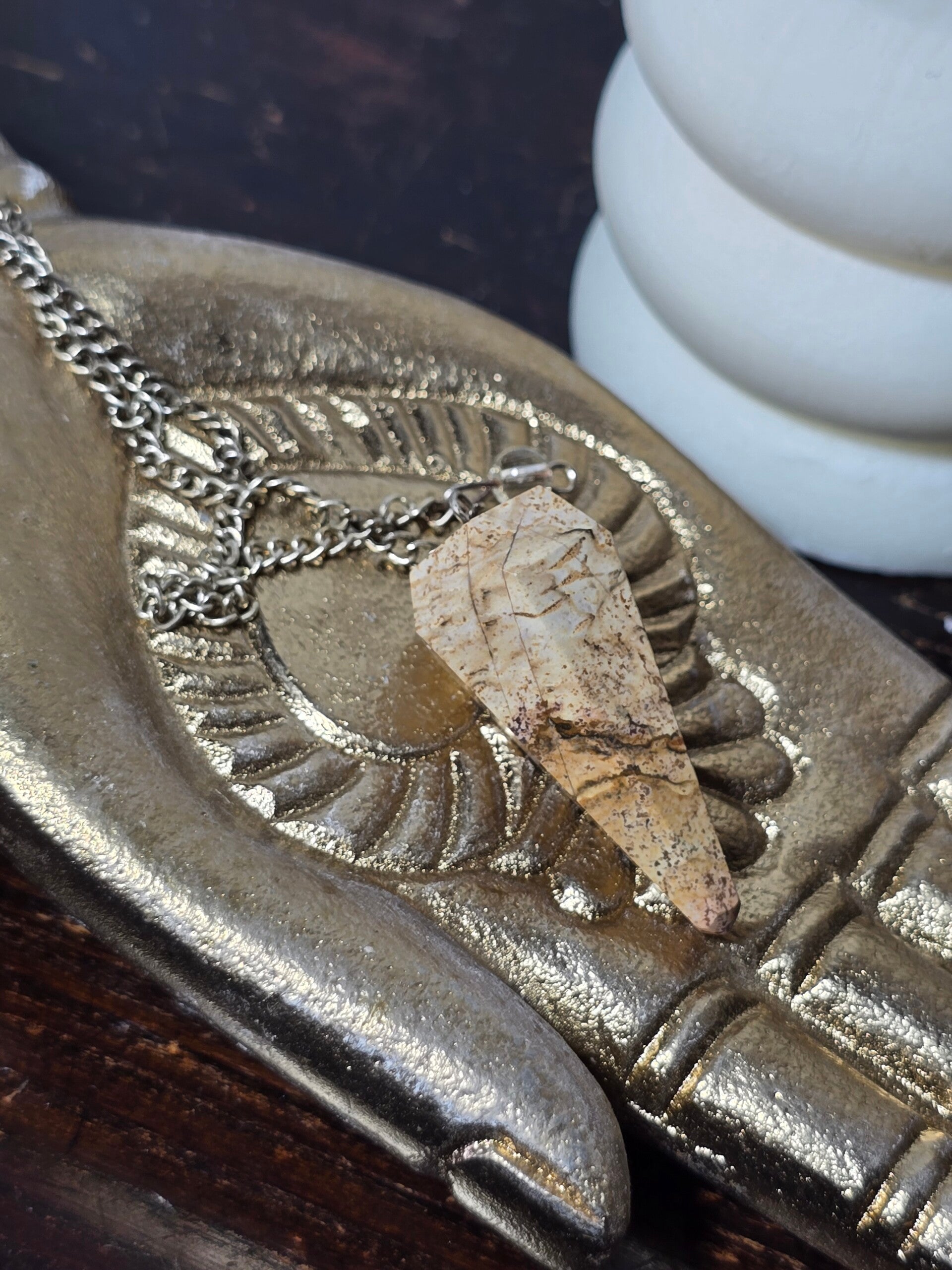 Pendolo realizzato in diaspro paesaggio, pietra dalle calde tonalità beige, sabbia, marrone e ocra, con venature naturali che ricordano panorami desertici e orizzonti lontani.